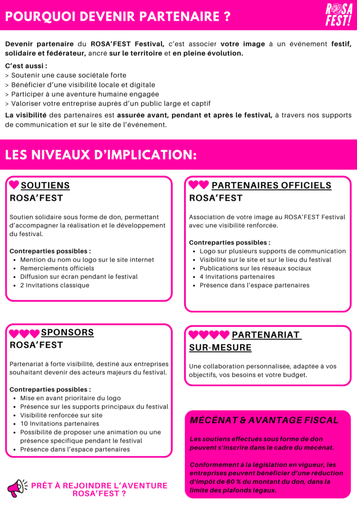 Rosa’Fest est un festival festif, accessible et ancré localement. En devenant soutien, vous contribuez directement au développement d’un projet culturel et humain qui fait vivre le territoire et rassemble le public autour de valeurs positives.